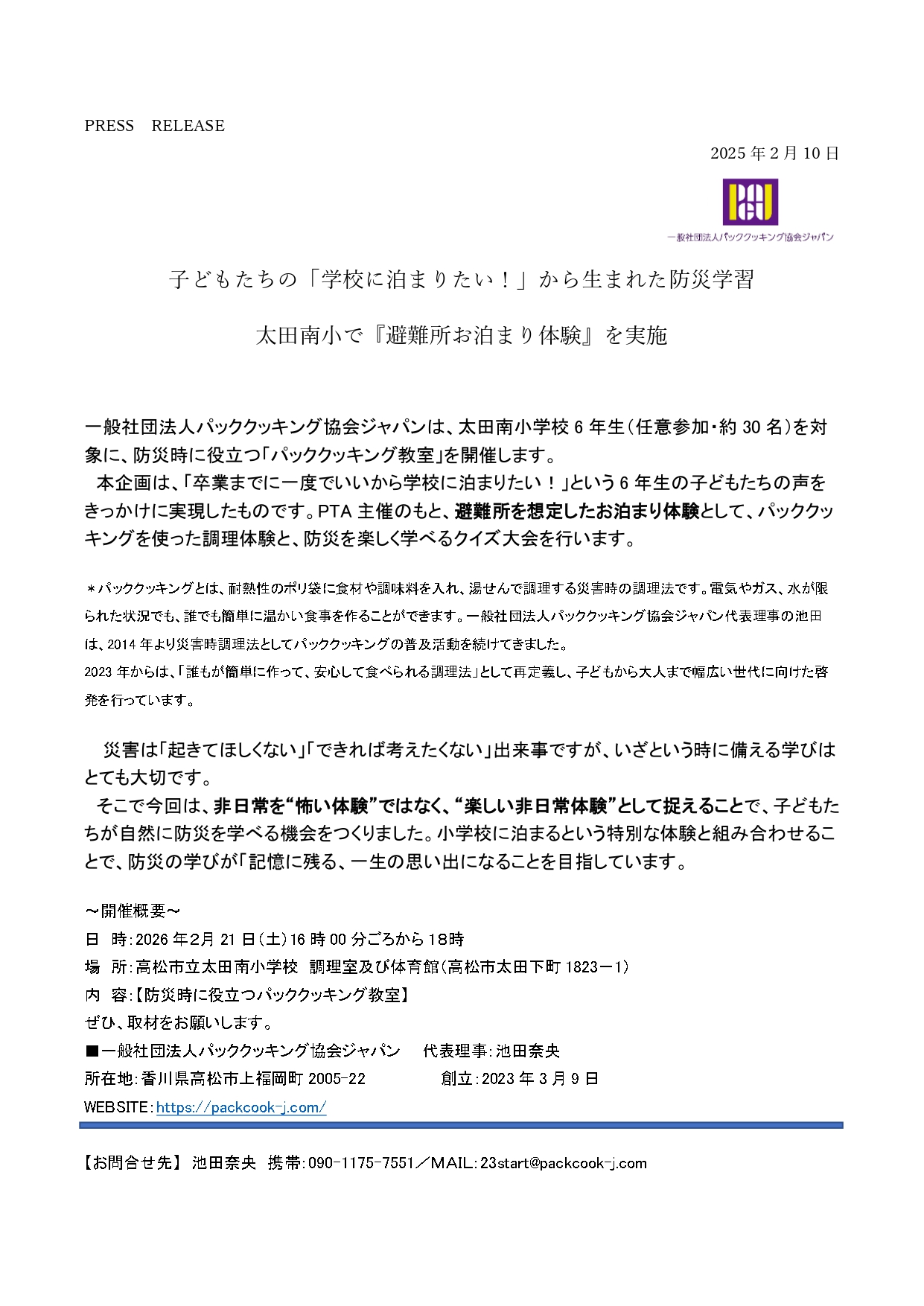 子どもたちの「学校に泊まりたい!」から生まれた防災学習プレスリリースしました 2026 2/10 本日、プレスリリースしました。子どもたちの学校に泊まりたい!という非日常体験から生まれた防災学習です。学びは、面白い・楽しい体験からこそ生まれる。そんな体験学習にしたいと思います。パッククキング協会ジャパン代表理事 池田奈央 お知らせ