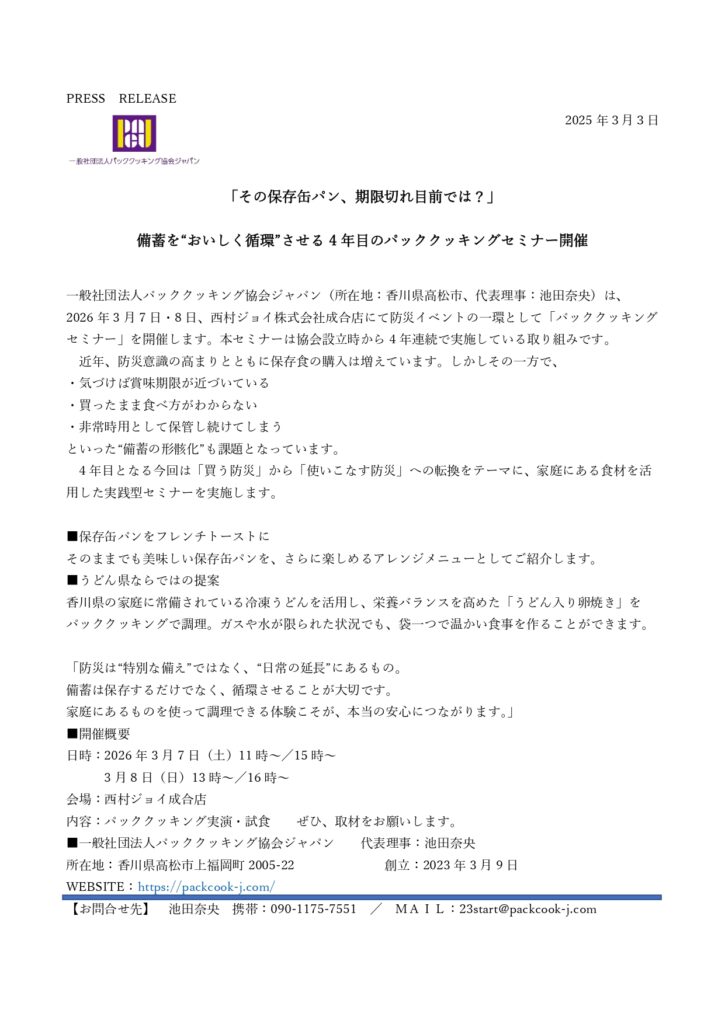 今年も西村ジョイ株式会社成合店様にて防災イベントの一環として「パッククッキングセミナー」を開催します。